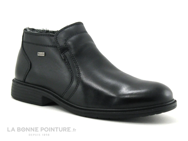 Ce bottillon semi montant Homme est en cuir lisse noir, revêtu d’une membrane imperméable Ultra Tex.