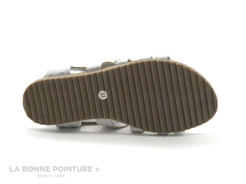 Cette chaussure enfant est argent pailleté, avec un lacet gris qui traverse 4 oeillet et permet d’ajuster la sandale spartiate au pied de l’enfant.