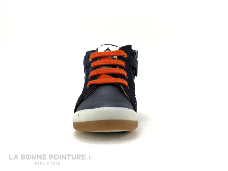 Cette chaussure bébé est en cuir de qualité bleu marine, avec une partie façon damier orange et bleue à l’arrière.