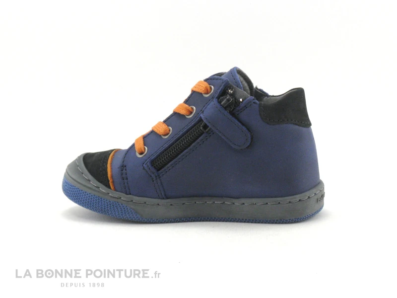 Cette basket montante premiers pas est en cuir bleu marine, avec du noir et du orange.