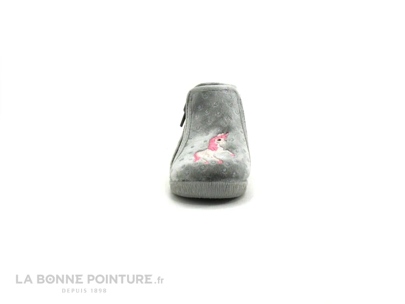 Ce chausson avec licorne Bellamy Kub est en velours gris clair, avec une licorne rose brodée à l’avant.