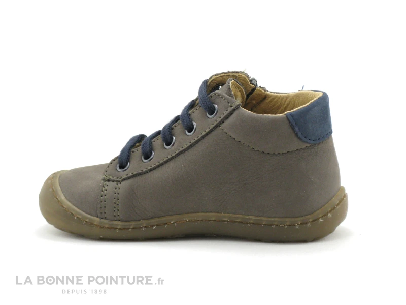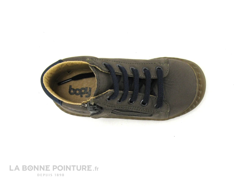Cette chaussure montante garçon Bopy est en cuir marron taupe aspect peau de pêche, avec une partie bleu marine à l’arrière.