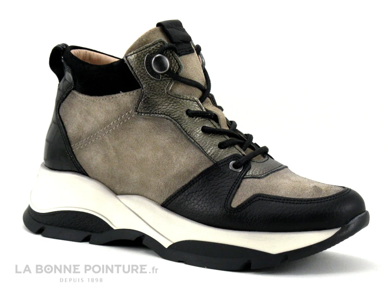 Cette basket montante Femme à semelle compensée est en cuir, combinant des parties noires et taupe velouté, noir grainé, et bronze métal.