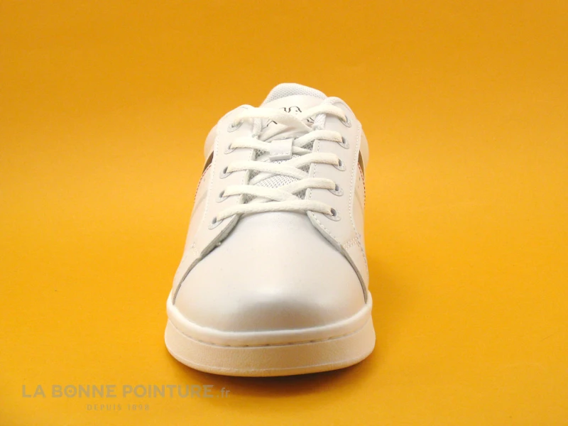 Cette tennis blanche unisex Kappa est principalement en simili cuir blanc, avec un empiècement beige sur l’arrière.