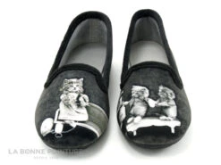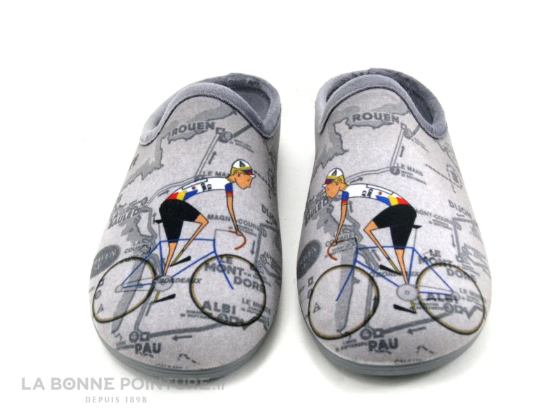 Cette belle pantoufle mule Homme Maison Espadrille 6790 Tour de France est en textile velouté gris, avec la carte de France et un coureur cycliste sur le devant.