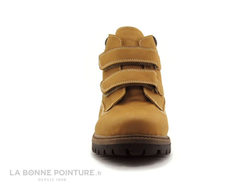 Cette chaussure montante enfant est en simili cuir camel / jaune gold, avec l’encolure noire et matelassée.