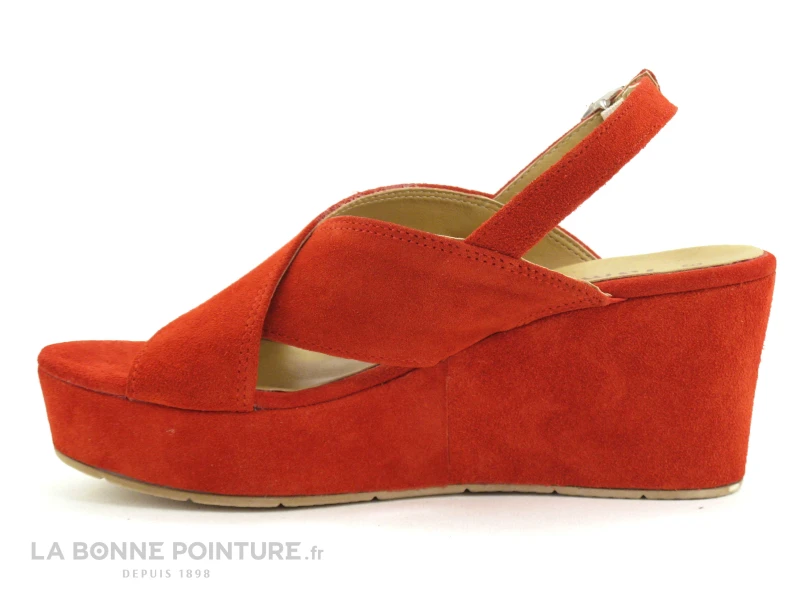 Ce nu-pieds rouge compensé est en cuir velours, composé de deux larges brides qui se croisent sur le devant.